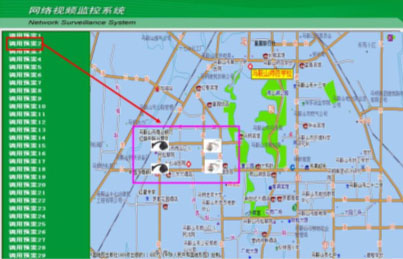 將城市的電子地圖分三個層次制作到系統(tǒng)管理主服務器中,可采用雙屏觀看,也可顯示到電視墻上;平時顯示第一層地圖,第一層為轄區(qū)的完整地圖,上面標有可以被激活的具有明顯標志的攝像機圖標;點擊攝像機標志可以打開本攝像機周圍小范圍的詳細實際地圖(第二層地圖),同時該攝像機的標志會閃動;再一次點擊閃動圖標,就可以顯示攝像機的實時圖像,可以是部分地圖和小的活動畫面(三層地圖),也可以完成全屏圖像顯示,并可以通過鼠標控制云臺和鏡頭的動作。