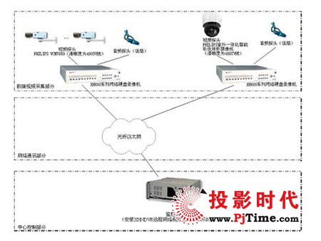 系統(tǒng)分前端視頻采集錄像、網(wǎng)絡(luò)通訊和中心錄像控制三個部分。前端主要指攝像頭、翔浩嵌入式硬盤錄像機(jī)及其輔助設(shè)備(視頻電纜、電源、支架、防護(hù)罩等)。網(wǎng)絡(luò)通訊過程主要使用水廠已有的光纖以太網(wǎng)進(jìn)行視頻信號的數(shù)字化傳輸。中心錄像控制為系統(tǒng)主要構(gòu)成部分,包括了視頻的處理(監(jiān)視、錄像、回放)和系統(tǒng)的控制(登錄、云鏡控制及系統(tǒng)設(shè)置等),以及通過網(wǎng)絡(luò)進(jìn)行分控和備份。