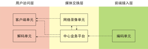 科達(dá)ViewShot網(wǎng)絡(luò)視頻監(jiān)控系統(tǒng)在邏輯結(jié)構(gòu)上分為前端接入、媒體交換以及用戶訪問三個層次,具體由中心業(yè)務(wù)平臺、網(wǎng)絡(luò)錄像單元、編碼單元、解碼單元和客戶端單元等設(shè)備組成。如圖1所示。