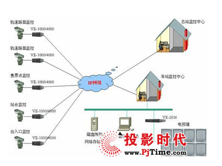 采用網(wǎng)絡(luò)化的視頻監(jiān)控技術(shù),就可以解決模擬監(jiān)控存在的以上問題,大大提高監(jiān)控效率和管理水平,同時(shí)也大大提高了監(jiān)控系統(tǒng)整體投資的經(jīng)濟(jì)性。將地鐵沿線的光纖傳輸網(wǎng)絡(luò)適當(dāng)改造一下,就可以構(gòu)建一個(gè)IP 的數(shù)據(jù)網(wǎng),并在各監(jiān)控點(diǎn)提供10/100/1000M的以太網(wǎng)接口。整個(gè)方案構(gòu)成如下: