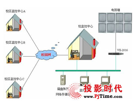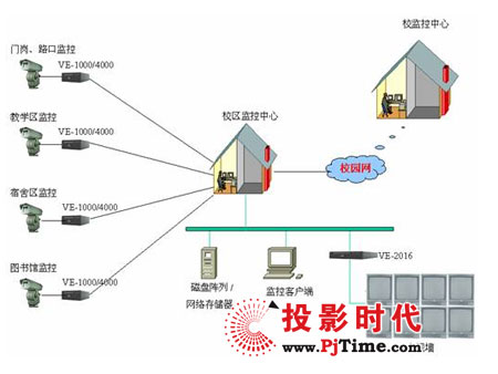 在校區(qū)監(jiān)控中心,可以利用PC式監(jiān)視器對前端監(jiān)控點的圖像實時監(jiān)控,也可以利用卓揚科技多路視頻解碼器VE2004、VE2016,將以太網(wǎng)傳輸過來的圖像進(jìn)行解碼,接入模擬監(jiān)視器或者電視墻進(jìn)行監(jiān)控。