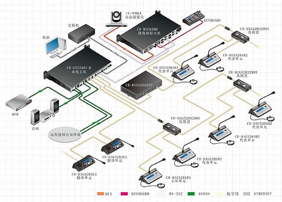 設計本系統(tǒng)部署數(shù)字會議系統(tǒng)服務,以簡單的網(wǎng)絡系統(tǒng)處理和傳送數(shù)字信號成為目前世界上最為先進的會議系統(tǒng)。數(shù)字化的會議系統(tǒng),在同一根電纜上實現(xiàn)多路同時發(fā)言,多路同時投票、表決等功能。它對于所有類型的會議都提供靈活的管理,具有多功能、高音質(zhì)、數(shù)據(jù)傳送保密等優(yōu)點,可以對會議的全過程實行全面的控制智能型會議系統(tǒng)由會議系統(tǒng)主機、會議主席發(fā)言單元、會議代表發(fā)言單元、會議管理軟件等組成。同時還有專業(yè)跟蹤攝像機,能夠自動實時跟蹤講話坐席。見下圖-系統(tǒng)連接圖