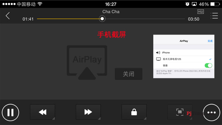 而對于極米助手客戶端內所帶的同屏功能,芒果小覓所支持的AirPlay就實用多了,通過AirPlay同屏可將智能設備上所播放影片及時的同步到投影設備投射出更大尺寸的畫面來欣賞,同時也可通過AirPlay功能使用大尺寸畫面來玩游戲。