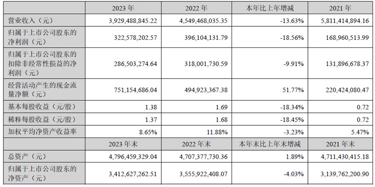 4月25日,鴻合科技發(fā)布2023年年度報告。報告期內(nèi),公司實現(xiàn)營業(yè)收入39.29億元,同比減少13.63%;實現(xiàn)利潤總額4.59億元,歸屬于上市公司股東的凈利潤3.23億元,同比減少18.56%;基本每股收益1.38元。截至2023年12月31日,公司總資產(chǎn)47.96億元,歸屬于上市公司股東的所有者權(quán)益34.13億元。
